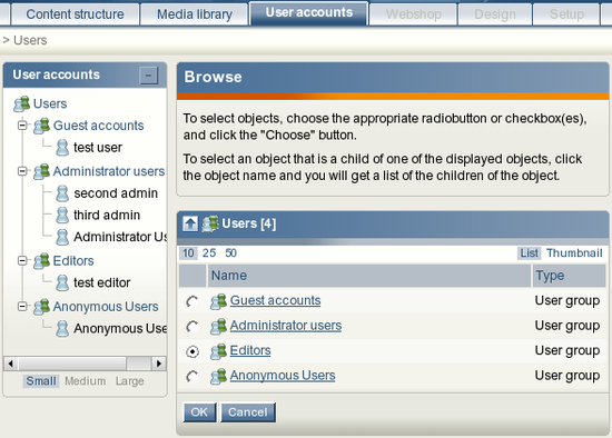 2. Select the "Editors" user group as shown in the following screenshot and click the "OK" button.