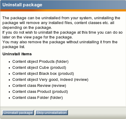 Click the "Uninstall package" button to continue or use "Skip installation" to abort the operation. If one of the listed content classes can not be removed, it will be skipped automatically. For example, the "Folder" content class will not be removed if it is used by one of the top level nodes. - If some of the items being removed have been modified after the package installation, the system will ask for confirmation before removing them (as shown in the following screenshot).